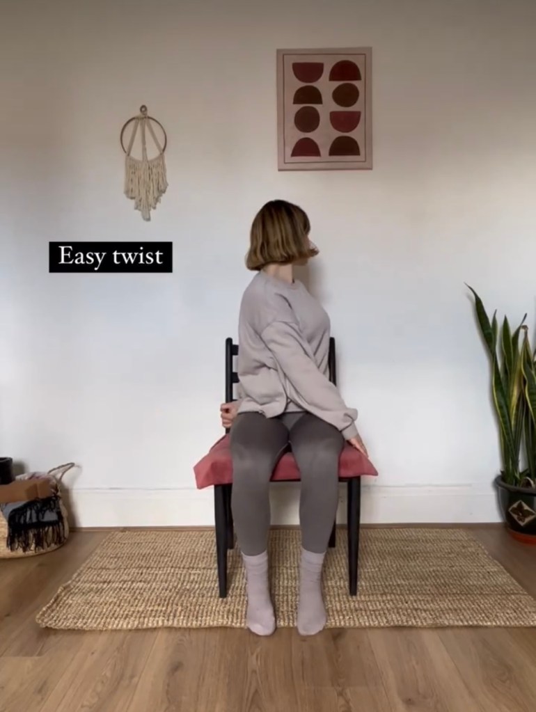Sit tall in your chair and and place your left hand on your right knee, gently twisting your torso to the right, reach your right hand behind you. Hold the twist for 30 seconds, feeling the release in your spine, then switch sides for balanced benefits.