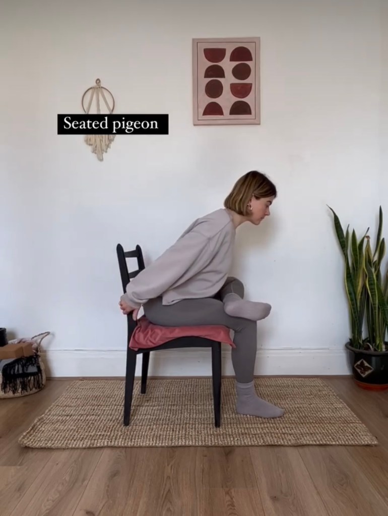 Shift forwards so your sitting bones are on the edge of your chair, lift your right foot off the ground and place your ankle on top of your left knee, keep your right knee pointing out to the side and your foot flexed. Holding on to the back of the chair with both hands, sit up tall and slowly lean your torso forward. Hold for 20-30 seconds before switching sides.