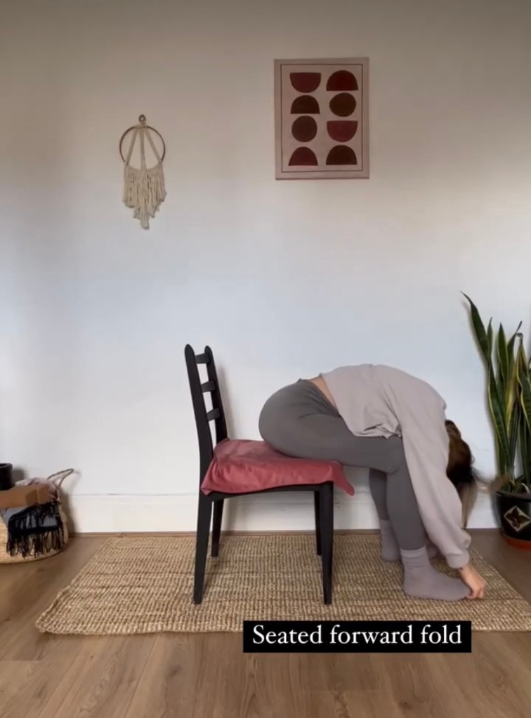 Sit on the edge of your chair with your feet hip-width apart. Inhale deeply, lengthening your spine, and as you exhale, hinge at your hips, reaching your hands towards the floor or your shins. Hold this forward fold for 30 seconds, allowing the stretch to gently release tension in your lower back and hamstrings.