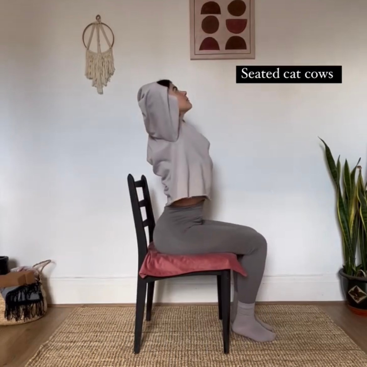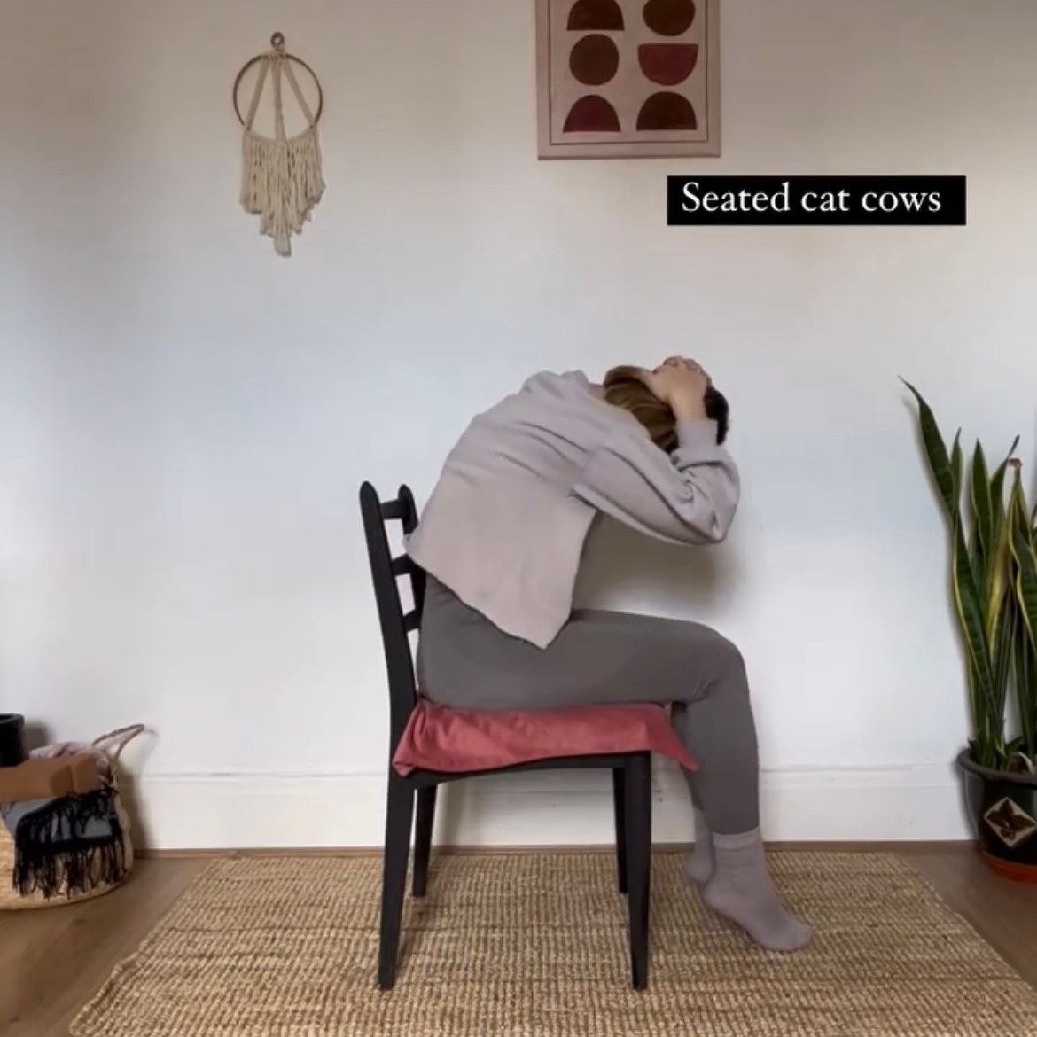 Begin by finding a comfortable seated position with your feet on the ground. Interlace your fingers and place them behind your head, keeping your shoulders open. Inhale deeply, arching your back and pushing your chest forward into the Cow position. As you exhale, round your spine, draw your elbows together and tuck your chin to your chest into the Cat position. Repeat this fluid movement for 1-2 minutes, focusing on the sensation of your spine moving smoothly.