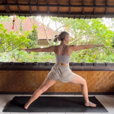 How to do it: Stand with your feet wide apart, turn your right foot out 90 degrees and your left foot in slightly. Extend your arms out to the sides and bend your right knee so it’s over your right ankle. Gaze over your right hand.