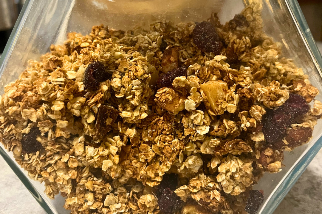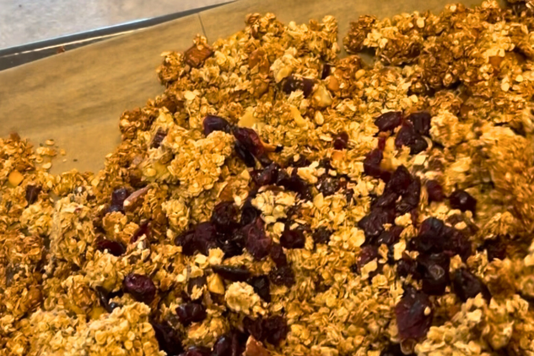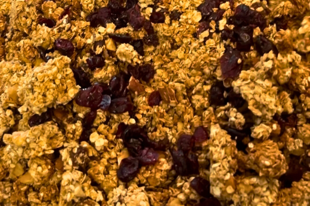- Allow the granola to completely cool so it can continue to crisp up (about an hour) then add your cranberries (plus any additional add-ins you may want) and break it up into chunky pieces.